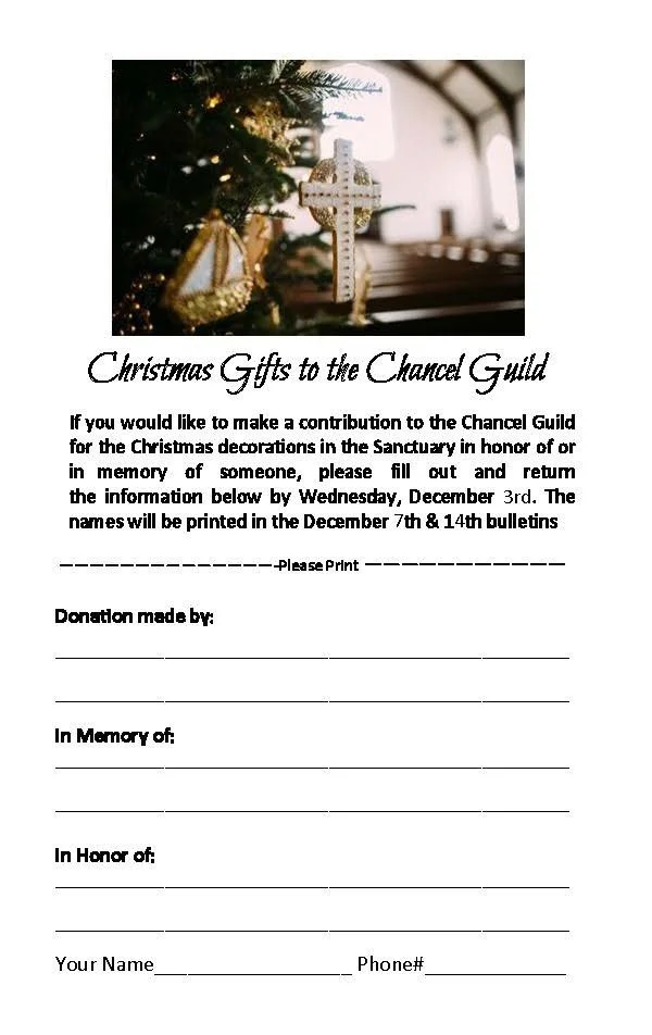 If you would like to make a contribution to the Chancel Guild for the Christmas decorations in the Sanctuary in honor of or in memory of someone, please fill out and return the information below by Wednesday, December 3rd. The names will be printed in the December 7th & 14th bulletins.