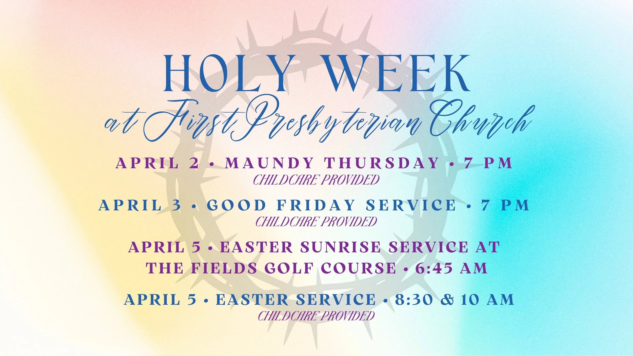 Back to All Events Holy Week at FPC Sunday, March 29, 2026 11:00 AM Sunday, April 5, 2026 12:00 PM Google Calendar ICS